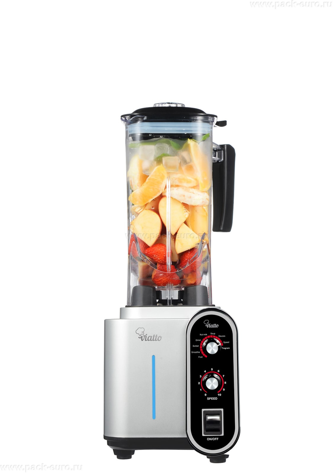 Блендер VIATTO VA-BL1899GR предназначен для измельчения продуктов и приготовления различных коктейлей, смузи, фраппе, соусов, фруктовых и овощных пюре и муссов на предприятиях общественного питания и торговли. Модель оснащена механической панелью управления с вариатором скорости. Корпус выполнен из пластика серого цвета, стакан - из прозрачного тритана, нож - из нержавеющей стали.