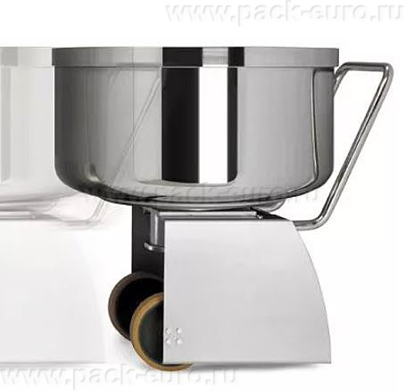 Инновационная и принципиально улучшенная система крепления дежи с помощью гидравлического конуса, обладает рядом преимуществ по сравнению с аналогичными тестомесами. Благодаря гидравлически постоянно поддавливаемому конусу дежа фиксируется с идеальным центрированием относительно месильного органа, что также позволяет сохранить все нужные параметры расстояния спирали относительно стенки дежи.