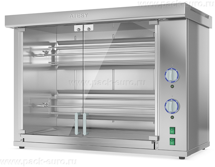 Гриль для кур ATESY Командор-2/2 М используется на предприятиях общественного питания и торговли для обжаривания целых тушек кур на вертелах (шампурах). Модель оснащена 2 съемными шампурами, каждый из которых рассчитан на 5 кур. Корпус и все внутренние элементы, контактирующие с продуктами, выполнены из пищевой нержавеющей стали AISI 430, двери - из закаленного термостойкого стекла.