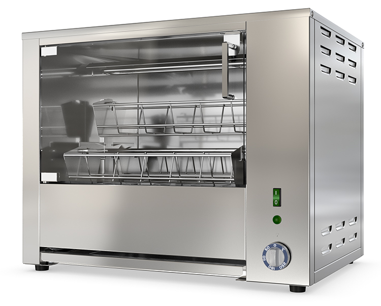 Гриль для кур ATESY Командор-4Э используется на предприятиях общественного питания и торговли для жарки тушек кур, цыплят, куриных окорочков, грудок и других продуктов питания. Модель оснащена 4 легкосъемными садками (люльками), вращающимися вокруг центральной оси внутри рабочей камеры. Корпус выполнен из пищевой нержавеющей стали AISI 430, садки для кур - из нержавеющего прутка, двери - из закаленного термостойкого ударопрочного стекла.