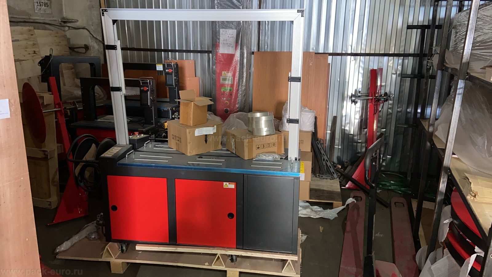 - Установка груза: Оператор помещает упаковку (коробку, паллету, стопку) на рабочий стол машины, в зону арки.